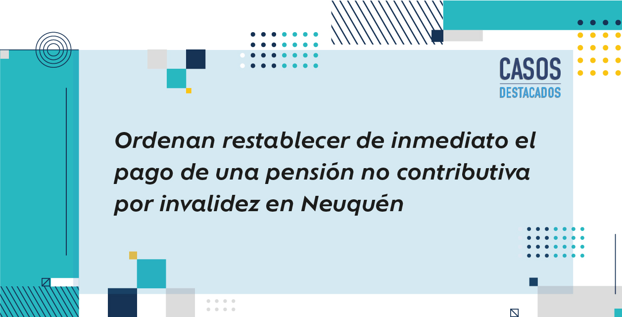El pasado 26 de agosto, el Juzgado Federal Nº1 de Neuquén ordenó a la Agencia Nacional de Discapacidad (ANDIS) el inmediato restablecimiento del pago de las prestaciones dinerarias correspondientes al mes en curso de una pensión no contributiva por invalidez. La decisión se adoptó a partir de una medida cautelar peticionada por J.C.T., un beneficiario de esa provincia representado por el defensor público oficial Pablo Matkovic, de la Unidad de defensa en materia no penal de la ciudad de Neuquén, perteneciente a la Coordinación General de Defensa de la Jurisdicción General Roca, a cargo de la Dra. Celia Delgado.