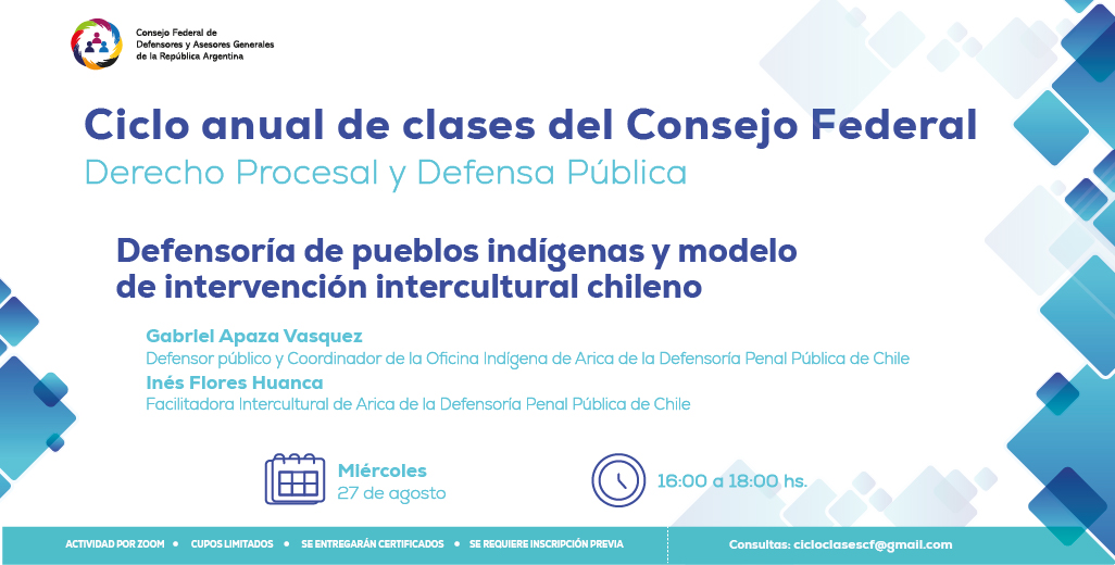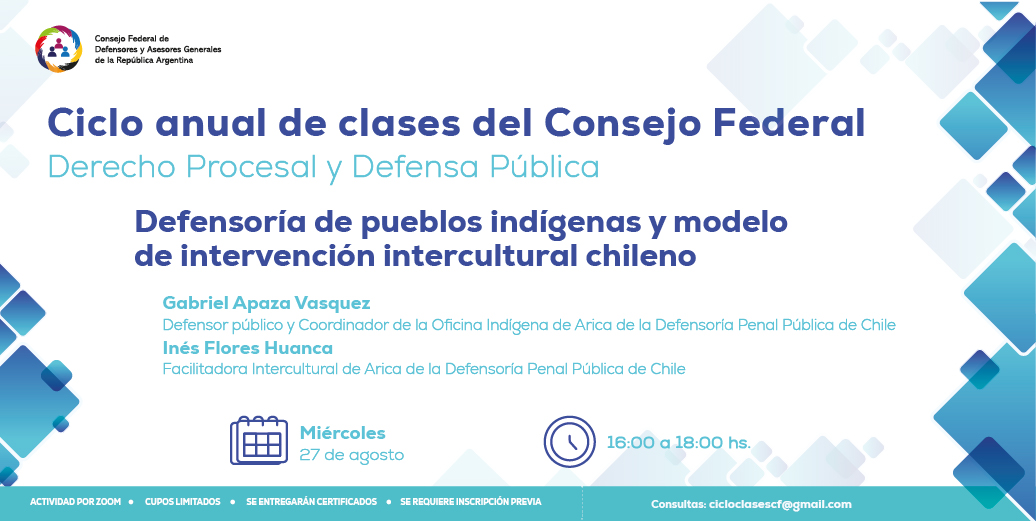 El próximo miércoles 27 de agosto, de 16 a 18 h, tendrá lugar la conferencia “Defensoría de pueblos indígenas y modelo de intervención intercultural chileno”, que dictarán el Dr. Gabriel Apaza Vasquez, Defensor Público y coordinador de la Oficina Indígena de Arica de la Defensoría Penal Pública de Chile; e Inés Flores Huanca, facilitadora intercultural de Arica de la Defensoría Penal Pública de Chile.