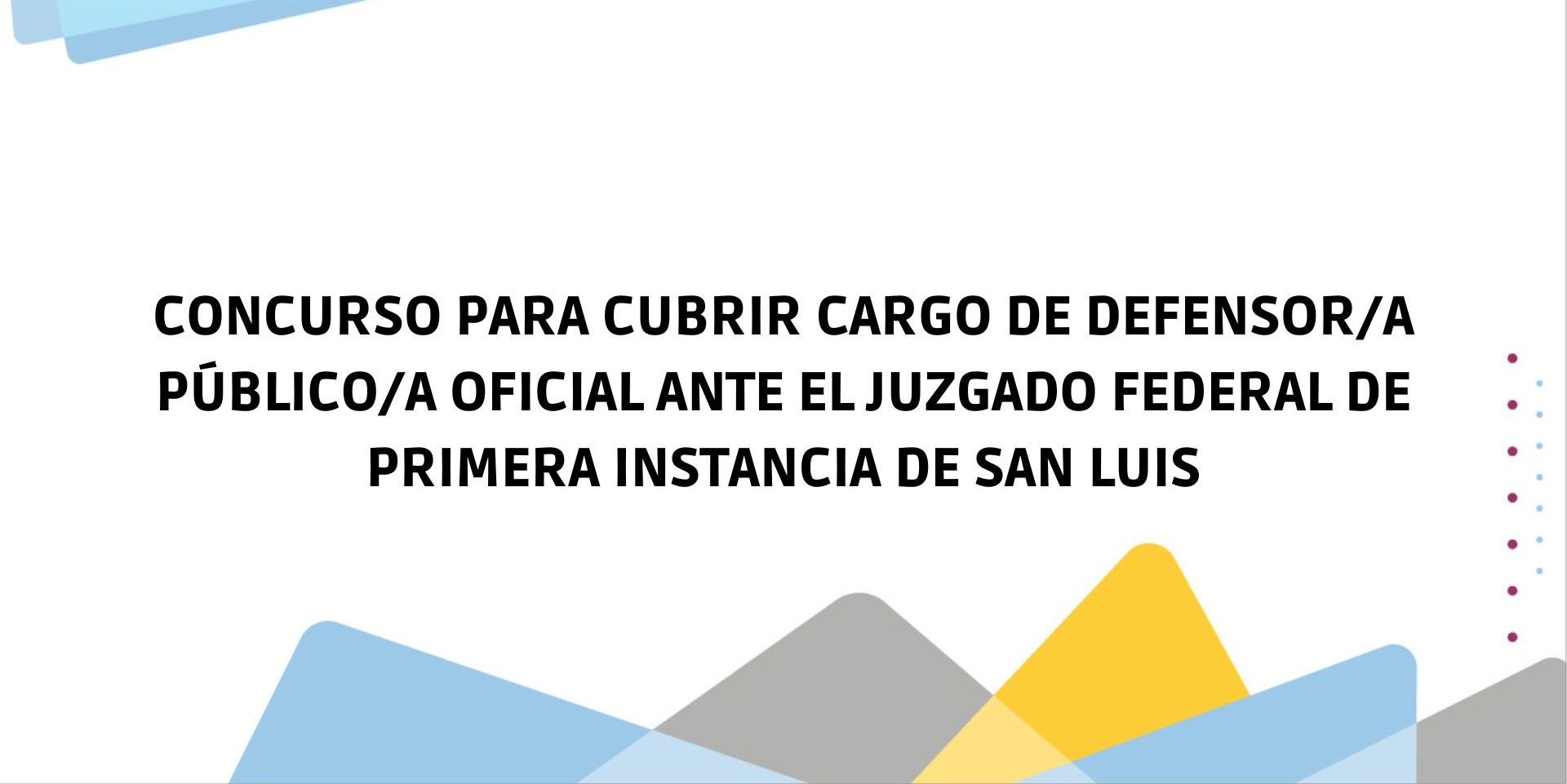 La Defensoría General de la Nación (DGN), a través de la Resolución DGN N°552/23, convoca a concurso público de antecedentes y oposición para cubrir el cargo de defensor/a público/a oficial ante el Juzgado Federal de Primera Instancia de San Luis, provincia de San Luis (CONCURSO Nº206, MPD).