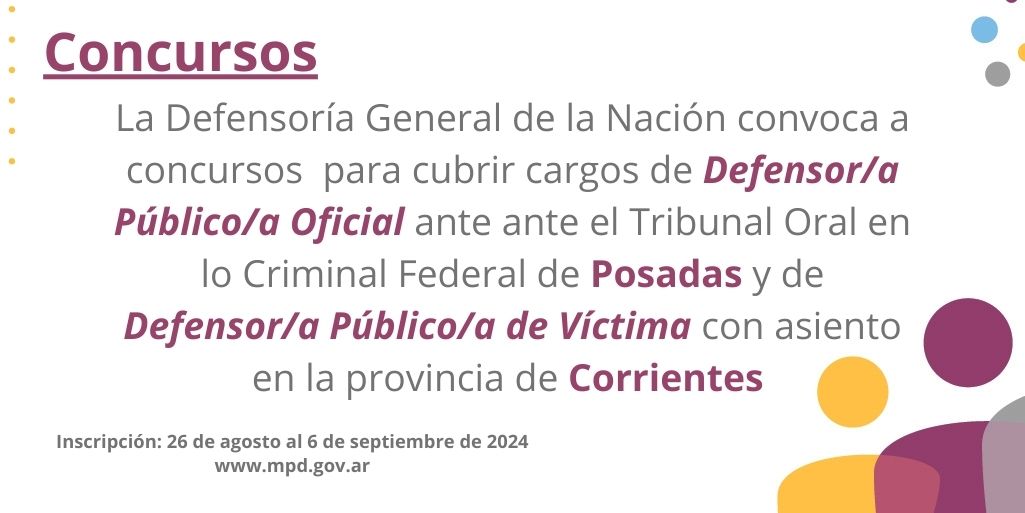 La Defensoría General de la Nación (DGN), a través de la Resolución DGN N°817/24, convoca a concursos públicos de antecedentes y oposición para cubrir cargos de Defensor/a Público/a Oficial ante el Tribunal Oral en lo Criminal Federal de Posadas, provincia de Misiones (CONCURSO Nº220) y Defensor/a Público/a de Víctima con asiento en la provincia de Corrientes (CONCURSO Nº221).