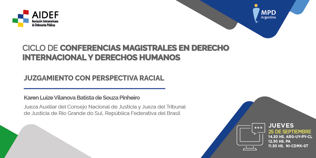 El próximo jueves 25 de septiembre, a las 14.30 h (ver horario para otros países en la imagen), la Dra. Karen Luize Vilanova Batista de Souza Pinheiro, Jueza auxiliar del Consejo Nacional de Justicia y Jueza del Tribunal de Justicia de Río Grande Do Sul, brindará la disertación "Juzgamiento con perspectiva racial".