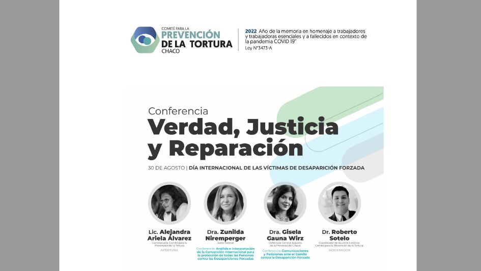 El próximo martes 30 de agosto a las 17 h se realizará la conferencia “Verdad, Justicia y Reparación”, organizada por el Comité Provincial para la Prevención de la Tortura y otros Tratos y Penas Crueles, Inhumanos o Degradantes. En esta ocasión, expondrán la Dra. Zunilda Niremperger, jueza federal; y la Dra. Gisela Gauna Wirz, defensora general adjunta de la Provincia del Chaco. La apertura estará a cargo de la Lic. Alejandra Ariela Álvarez, comisionada del Comité para la Prevención de la Tortura, y el moderador del encuentro será el Dr. Roberto Sotelo, coordinador de Asuntos Jurídicos del Comité para la Prevención de la Tortura.