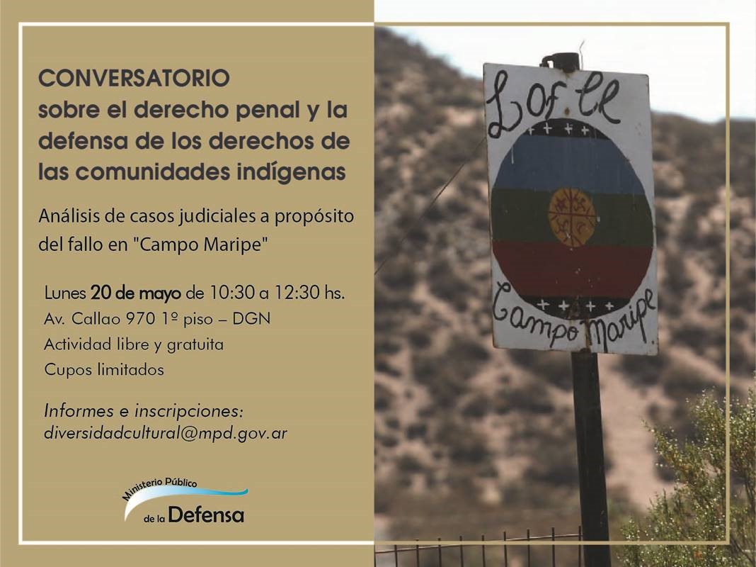 El próximo lunes 20 de mayo en la sede de la Defensoría General de la Nación (Av. Callao 970, 1º piso) se llevará a cabo el “Conversatorio sobre el derecho penal y la defensa de los derechos de las comunidades indígenas: Análisis de casos judiciales a propósito del fallo en Campo Maripe”. La apertura del evento, a desarrollarse entre las 10.30 y 12.30 h, estará a cargo de la defensora general de la Nación, Stella Maris Martínez.