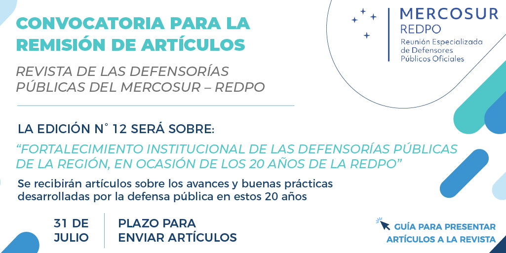 Extendemos a los y las integrantes del Ministerio Público de la Defensa la convocatoria al envío de artículos para la próxima edición de la Revista de la Reunión Especializada de Defensoría Públicas Oficiales (REDPO) del Mercosur.
