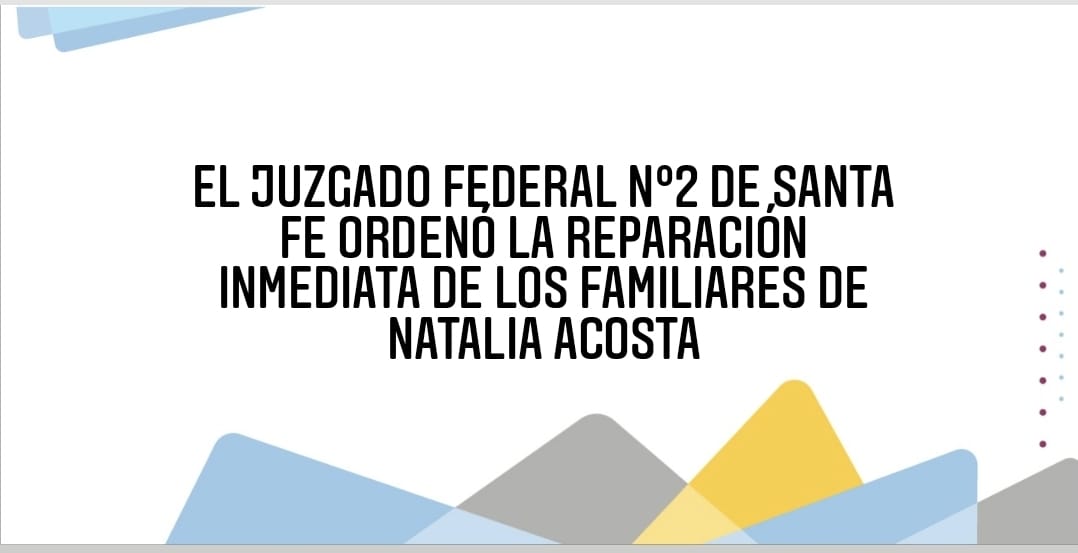 El Juzgado Federal Nº2 de Santa Fe dispuso hoy que se repare económicamente al padre y la hermana de Natalia Acosta, víctima de trata de personas que desapareció el 29 de mayo de 2009 en la ciudad de Santa Fe. Es la primera vez que la justicia reconoce el derecho a reparación de dos víctimas indirectas en un caso de trata de personas. La suma deberá ser afrontada por el recientemente creado Fondo de Asistencia Directa a Víctimas de Trata y la familia indicó que utilizará el monto reparatorio para continuar con la búsqueda de Natalia.