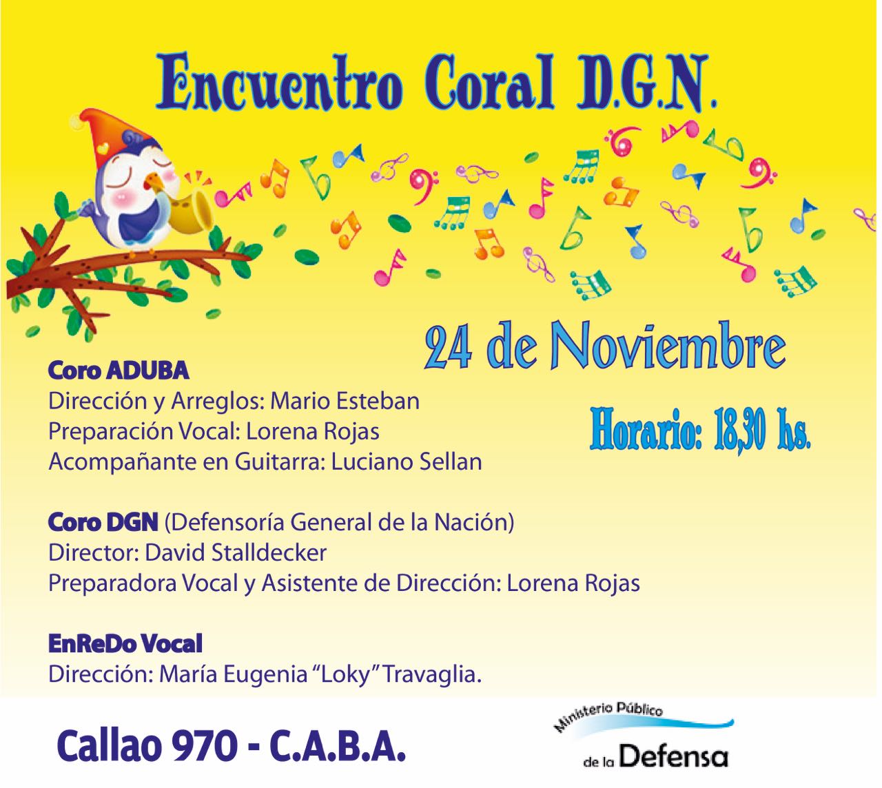 El jueves 24 de noviembre, a las 18.30 horas, el Coro de la DGN, junto con el Coro de ADUBA (Asociación de Docentes de la UBA) y el Grupo EnReDO vocal, se presentarán en el Auditorio de la DGN, Callao 970.