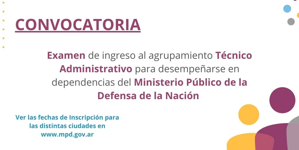 La Defensoría General de la Nación (DGN), a través de la Resolución DGN Nº1005/2024, convoca a examen para el ingreso al agrupamiento Técnico Administrativo (TA) para desempeñarse en dependencias del Ministerio Público de la Defensa de la Nación (MPD) con sede en las ciudades de: