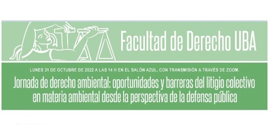 El próximo 31 de octubre a las 14 h, se realizará en el Salón Azul de la Facultad de Derecho de la Universidad de Buenos Aires la “Jornada de derecho ambiental: oportunidades y barreras de litigio colectivo en materia ambiental desde la perspectiva de la defensa pública”. El evento está organizado por el Ministerio Público de la Defensa (MPD) y por el Centro de Derecho Ambiental de la Facultad de Derecho.