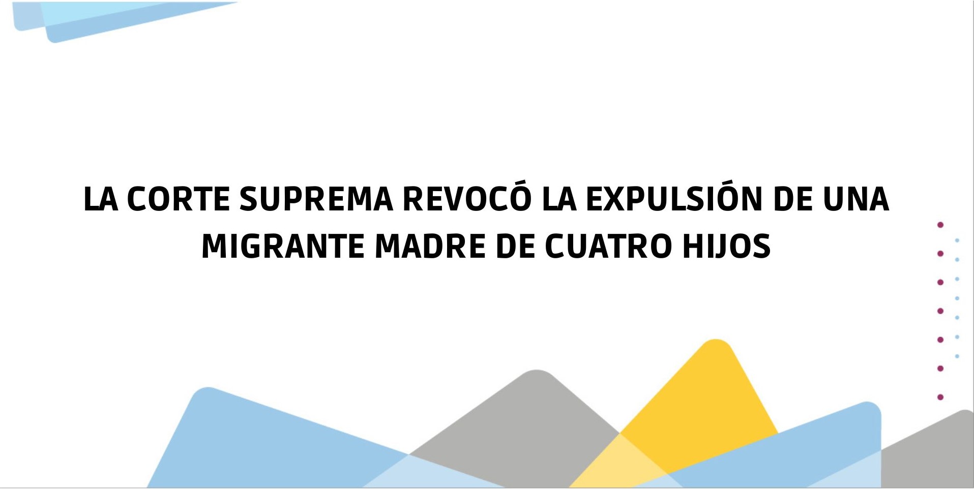 El pasado 6 de septiembre, la Corte Suprema de Justicia de la Nación (CSJN) revocó la orden de expulsión de una mujer migrante quien se encuentra a cargo exclusivo de sus hijos y que había sido condenada a prisión efectiva por tráfico de estupefacientes. El caso llegó al máximo tribunal mediante un recurso de queja impulsado por la Comisión del Migrante de la Defensoría General de la Nación (DGN), quien sostuvo que la expulsión fue ratificada en segunda instancia judicial sin considerar el derecho a la reunificación familiar ni el interés superior del niño en el contexto de un hogar monoparental y de extrema vulnerabilidad.