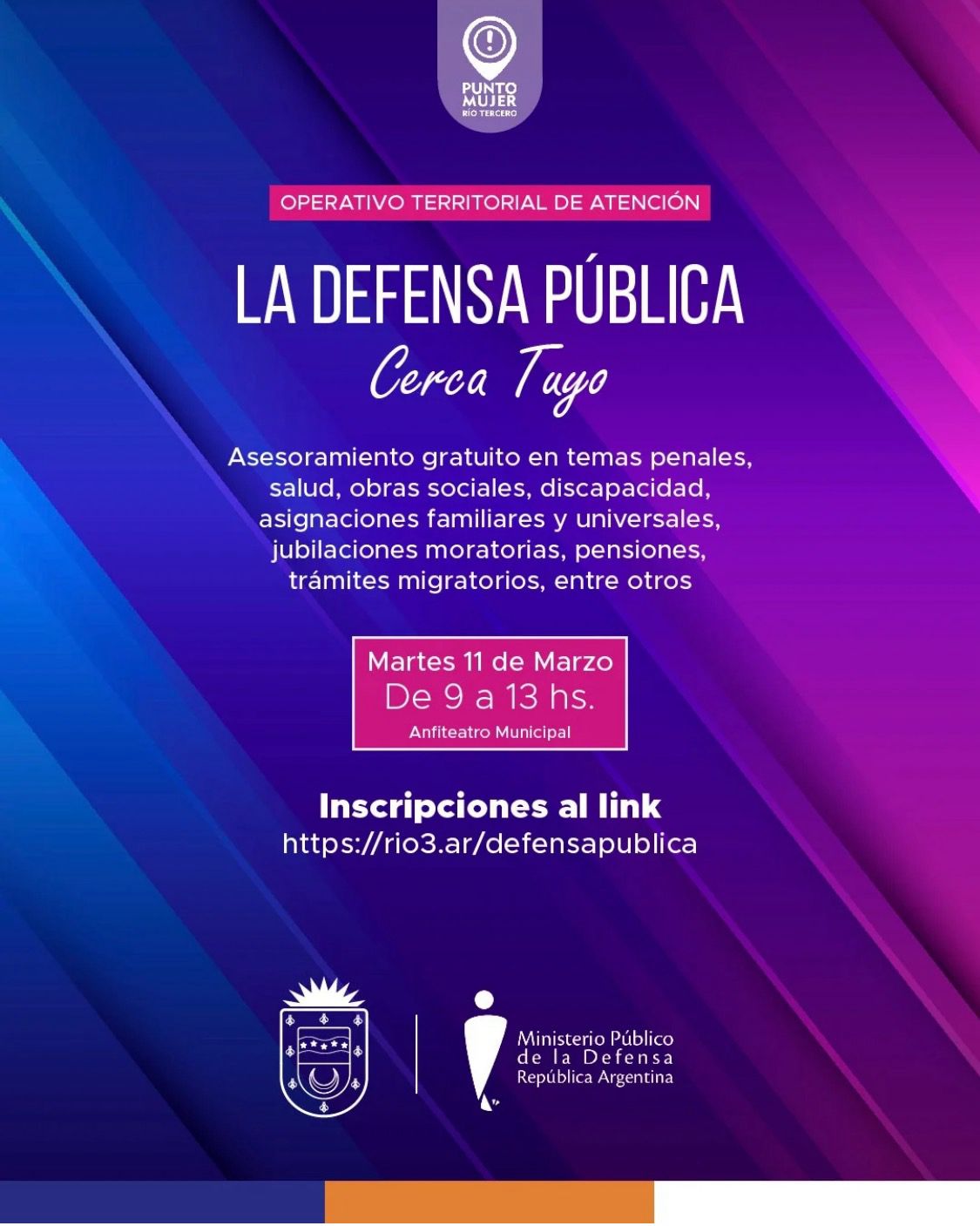 Mañana, de 9 a 13 h, se realizará el operativo territorial de atención "La Defensa Pública Cerca Tuyo", donde personal de la Defensoría Pública Oficial ante el Juzgado Federal de Primera Instancia de Villa María, a cargo de la Dra. María Luz Felipe, estará disponible para evacuar consultas y brindar asesoramiento jurídico gratuito a los vecinos de Río Tercero.