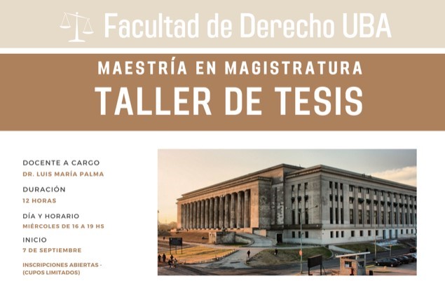 Informamos a los/as integrantes del Ministerio Público de la Defensa que se encuentra abierta la inscripción a la segunda edición del curso “Taller de Tesis”, dictado en el marco de la Maestría en Magistratura de la Facultad de Derecho de la Universidad de Buenos Aires. La capacitación se desarrollará a partir del próximo 7 de septiembre, a cargo del docente Dr. Luis María Palma.