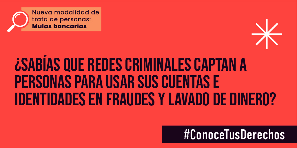El Programa de Asesoramiento y Promoción de Derechos de las Víctimas del Delito de Trata de Personas de la Defensoría General de la Nación (DGN) presenta su nueva publicación “Trata de personas con fines de criminalidad forzada: mulas bancarias o de dinero”, donde se analiza una nueva manifestación del delito de trata de personas que tiene como víctimas de explotación a las denominadas “mulas financieras”, “mulas bancarias” o “mulas de dinero”.